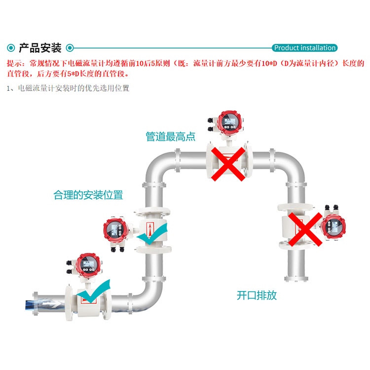 c.流量計(jì)安裝需要滿足前后直管段的要求,常規(guī)場(chǎng)合下,流量計(jì)入口前段保留10DN,流量計(jì)出后后端保留5DN。