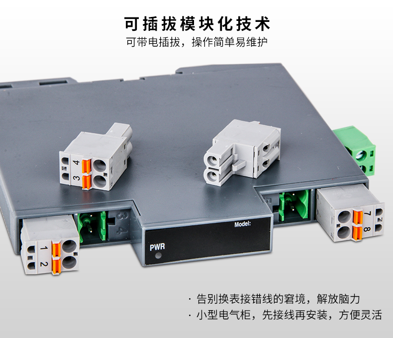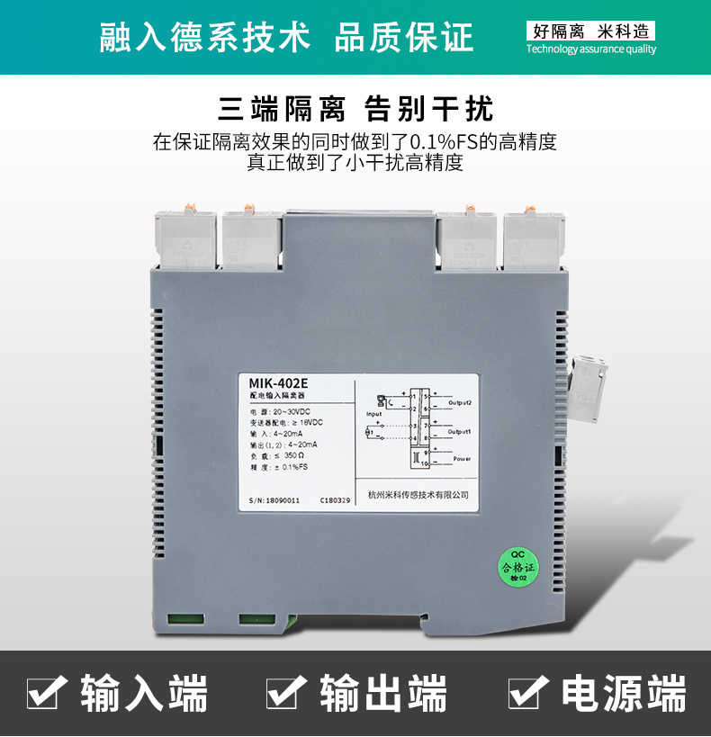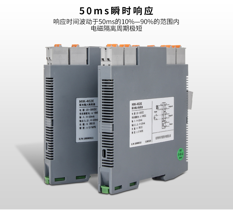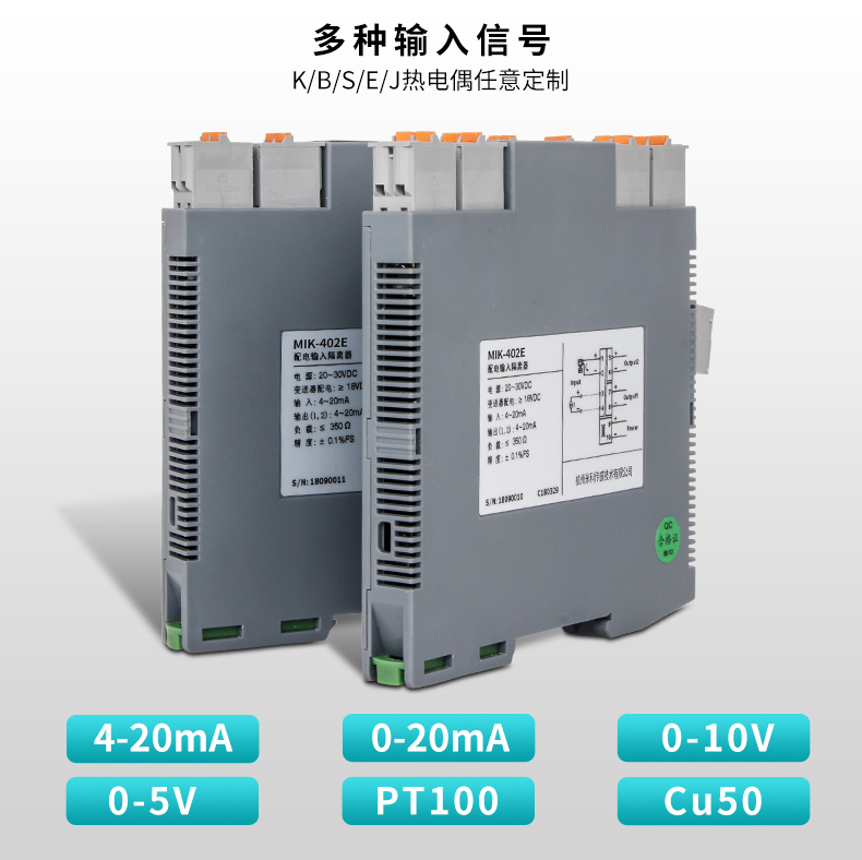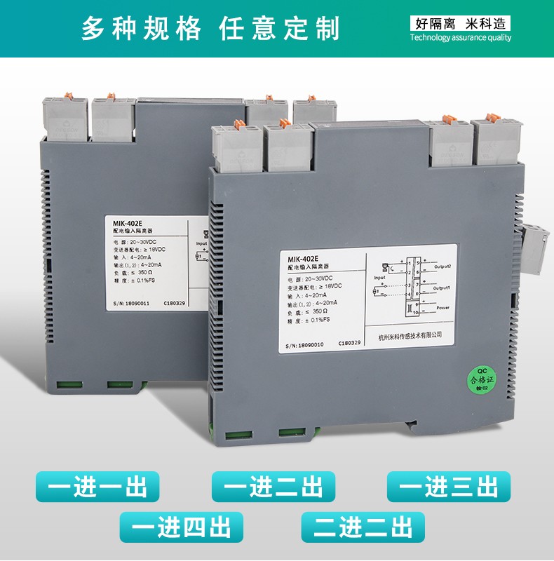 MIK-402E系列信號(hào)隔離器,電壓、電流隔離器將直流電壓或電流信號(hào)經(jīng)過隔離傳送,轉(zhuǎn)換成所需的信號(hào)給其他儀表??梢耘c單元組合儀表及DCS、PLC等系統(tǒng)配套使用,給予現(xiàn)場(chǎng)儀表信號(hào)隔離、信號(hào)轉(zhuǎn)換、信號(hào)分配、信號(hào)處理等,從而提高工業(yè)生產(chǎn)過程自動(dòng)控制系統(tǒng)的抗干擾性能力,保證系統(tǒng)的穩(wěn)定性與可靠性。本產(chǎn)品品種分為一進(jìn)一出、一進(jìn)二出、一進(jìn)三出、一進(jìn)四出、二進(jìn)二出,且輸入、輸出、電源三端隔離。并且大量運(yùn)用于配電柜和隔離箱等各種工業(yè)場(chǎng)合。