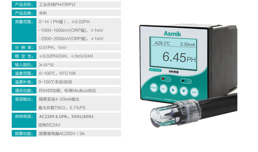 適用場合:紡織印染、工業(yè)廢水、自來水廠、污水處理廠、電鍍廢水等液體PH測量。 MIK-PH160儀表實現(xiàn)4-20mA信號輸出、繼電器報警輸出以及RS485通訊,搭配PH上位機(jī)軟件,可實現(xiàn)對多臺PH控制器聯(lián)機(jī)進(jìn)行系統(tǒng)性監(jiān)控的功能。